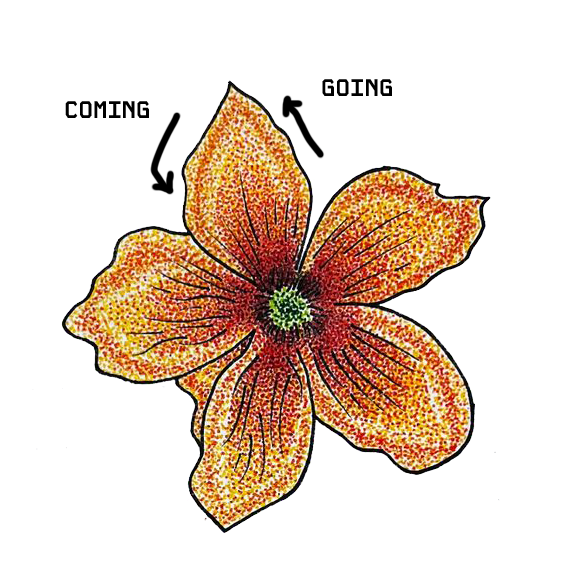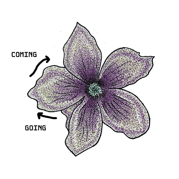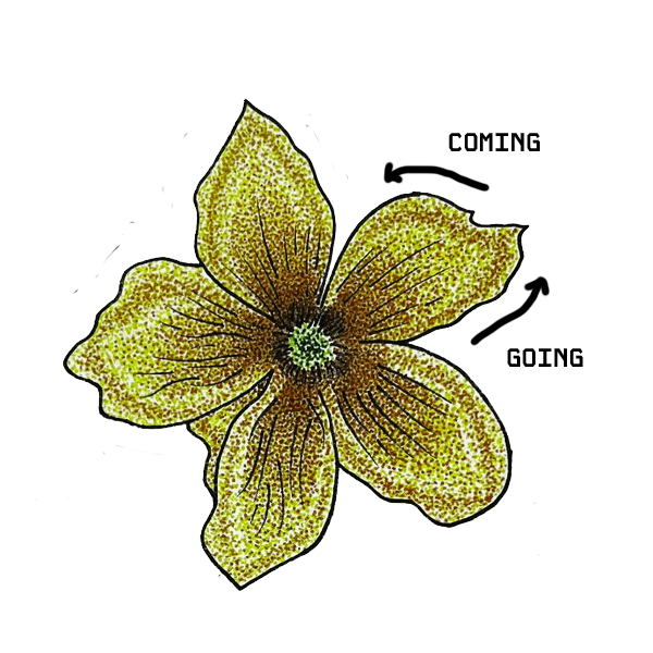 "Coming" toward the center of the flower alludes to forming a polygynous group with him. The union is magnetic and dynamic. "Going" from the center to the periphery alludes to peaceful cohabitation and formation of an alpha unit with the women. The secret order is 2.